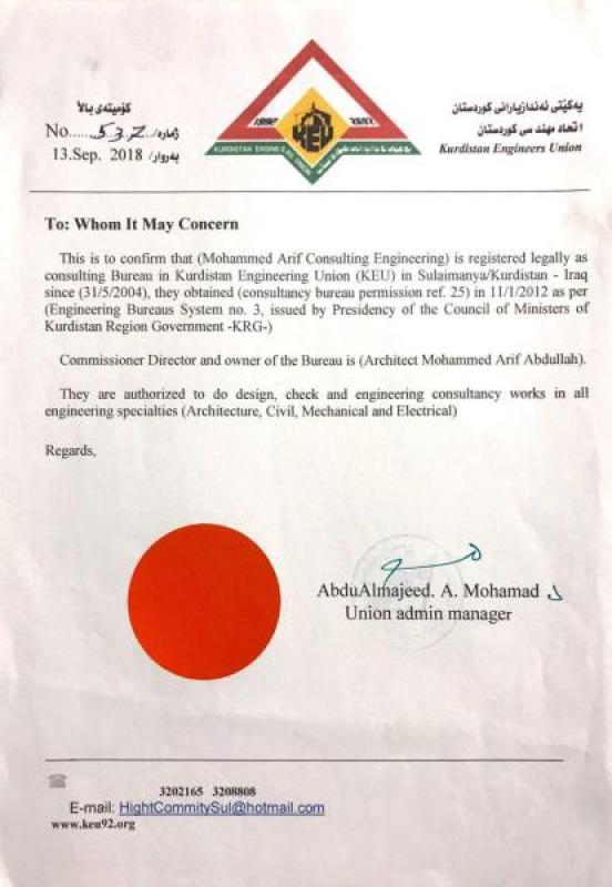 In 2004, some experienced staff of lecour associates gained a permission to work as consultancy firm through Kurdistan engineering union, legally (MA) permitted to provide all engineering specialties. After approving (General rules of Engineer’s consultancies firms) in Iraqi Kurdistan region preeminent in 2012, (Mohammed Arif Consultants) received permission from Kurdistan Engineering Union (KEU) under ref.no.(25).